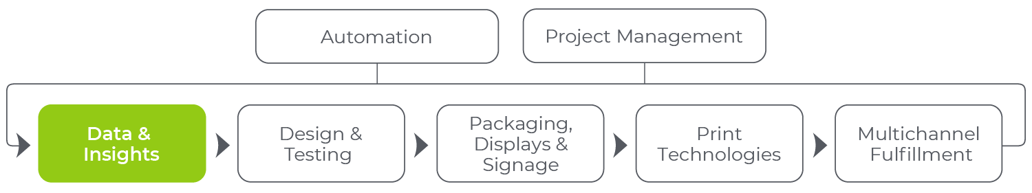 Our proprietary analytics tool benchmarks the key attributes of what’s winning in store and on the porch and how your brands and your competitor’s brands are performing. Every day, we have a team that’s in store, determining what’s winning and what’s not. We also have a team that’s ordering, unboxing, and examining packaging at home. Last year, we audited over 3,500 e-commerce packages and 150,000 retail displays. Each observation becomes a data point for over 600 brands with all major retailers. Our North American design team then leverages this data to create programs that help brands win.
